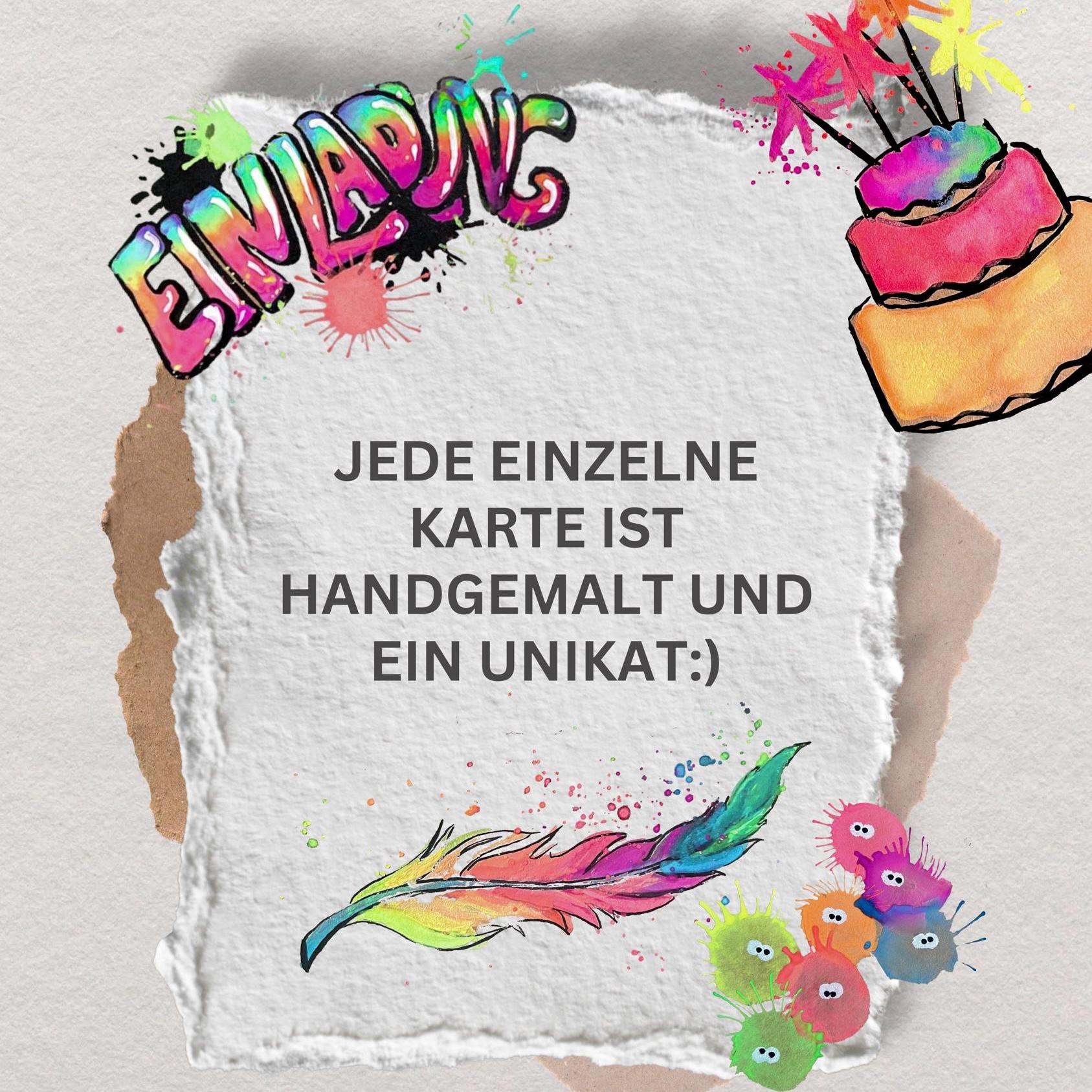 This lovingly painted card (A6) with a party motif in neon colors (glows under black light) is the perfect invitation for any birthday, big or small, celebration, or theme party. The motif is hand-painted, making each card an original. A beautiful eye-catcher in vibrant colors.