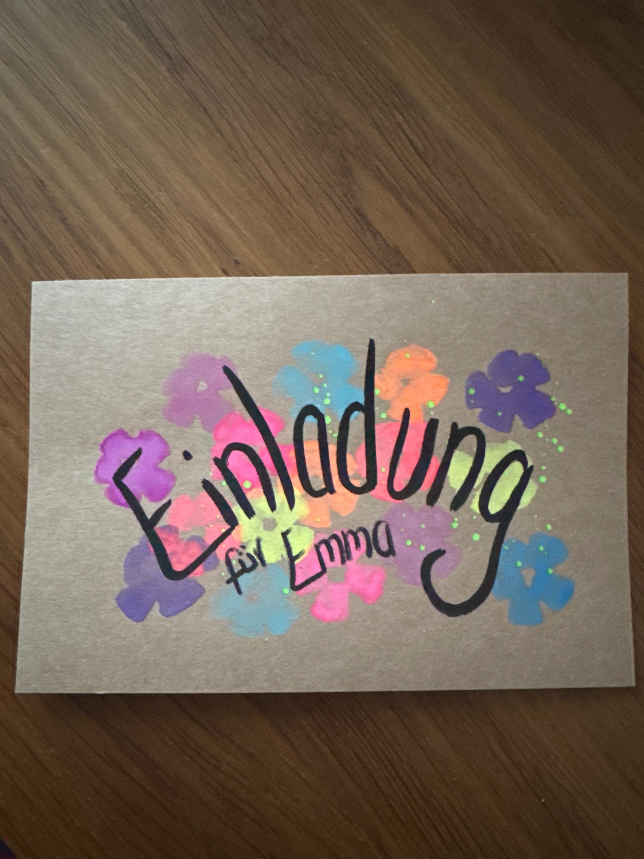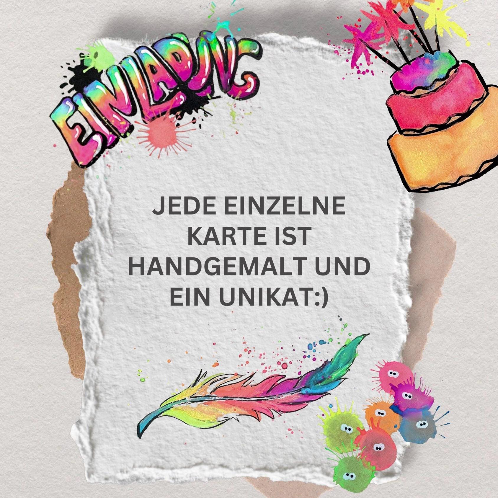 This lovingly hand-painted card (A6 size) with a neon-colored party motif (glows under blacklight) is the perfect invitation for any children's birthday, celebration, or themed party. The design is hand-painted, making each card unique. A beautiful eye-catcher in vibrant colors.